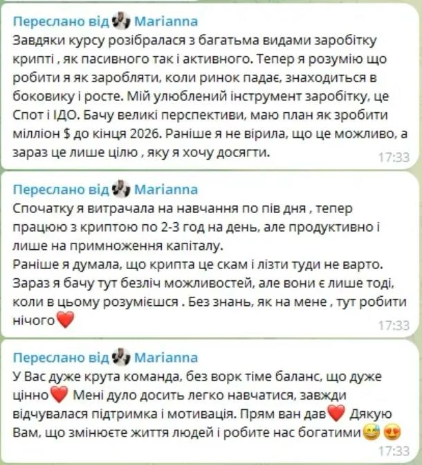 Результат: створила портфель, використовує стейкінг (криптодепозити) та торгові боти. Отримує прибутки напівпасивно, приділяючи 2-3 години на тиждень.
